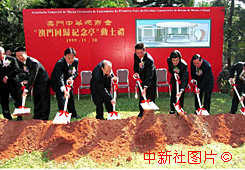 澳門中華總商會(huì)建造"澳門回歸紀(jì)念亭" 中新社傳真 毛建軍 攝 澳門中華總商會(huì)建造"澳門回歸紀(jì)念亭"動(dòng)土儀式三十日在澳門何賢公園舉行,澳門特區(qū)首任行政長(zhǎng)官何厚鏵(左五)、澳門中華總商會(huì)會(huì)長(zhǎng)馬萬(wàn)祺(左四)、新華社澳門分社副社長(zhǎng)宗光耀(左三)等嘉賓出席。 |