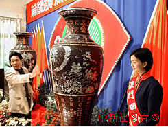 海南省祝賀澳門回歸的禮品—— “椰樹傳說”和“天涯歡歌”巨型椰雕嵌貝花瓶二月一日下午在海口市正式亮相,不日將運往珠海然后送抵澳門。兩座花瓶各重八十公斤,高一千九百九十九毫米。這對花瓶由海南省藝術家設計,?谑幸駨S的三十名工匠共同制作完成的。