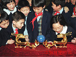 為慶祝澳門回歸,迎接新世紀(jì)的到來,北京二十一世紀(jì)實(shí)驗(yàn)學(xué)校的師生,一日舉行喜迎巨型雕塑「中華正氣龍」抵京 儀式。圖為學(xué)生們正在聚精會神的觀賞一對小型中華正氣龍雕塑。