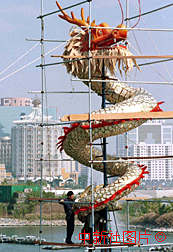 為迎接澳門回歸,澳門南灣湖內(nèi)正在加緊安裝“群龍戲水”等四組大型燈飾。