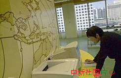 澳門回歸前夕,新聞中心展開新聞大戰(zhàn),香港記者在世界地圖前發(fā)稿。中新社傳真 王瑤攝