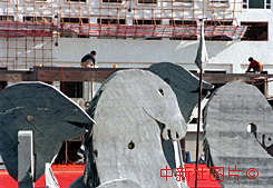 9日,澳門回歸政權交接儀式會場工程進入收尾階段,工人在海馬噴泉前加緊裝飾.