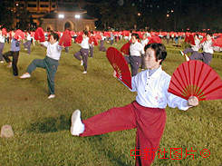 廣州市慶澳門回歸中心會場文藝晚會十一日晚抓緊演練,市太極拳研究會的五百名會員在中山紀(jì)念堂排練太極雙扇舞。