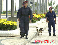 澳門特警隊(duì)員帶領(lǐng)警犬在政權(quán)交接場(chǎng)地四周巡羅檢查。