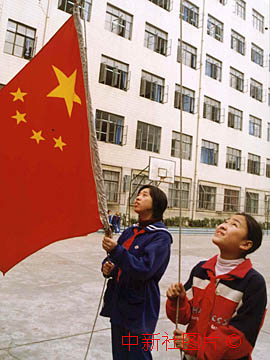 上海東風(fēng)中學(xué)虞維詩(shī)(右)是澳門籍學(xué)生,在澳門回歸前的這一個(gè)星期中,學(xué)校特地將每天清晨升國(guó)旗的任務(wù)交給她。圖為虞維詩(shī)17日與同學(xué)一起升國(guó)旗的情景。