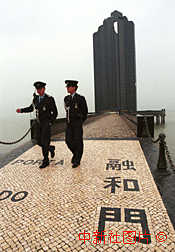 澳門(mén)警察在海濱紀(jì)念建筑融和門(mén)前執(zhí)勤。中新社傳真 彭振戈攝