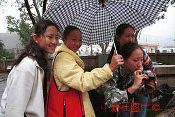 前來(lái)澳門(mén)參加歡慶回歸文藝演出的北京女藝員,十八日在小雨中到媽姐廟前觀光拍照。 中新社傳真 彭振戈攝