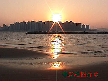 1999年12月20日,澳門特區(qū)迎來第一個日出。畫面中建筑群是澳門凼仔島。網(wǎng)友陳偉錄攝于珠海橫琴島。