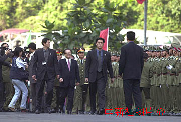 國(guó)家主席江澤民二十日在澳門參加回歸慶典中,來(lái)到剛剛進(jìn)駐澳門鬧市里的解放軍軍營(yíng),檢閱未洗征塵的三軍將士! ≈行律鐢(shù)碼傳真 毛建軍 攝