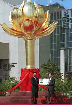 國(guó)務(wù)院副總理錢(qián)其琛二十日代表中國(guó)中央政府向澳門(mén)特區(qū)贈(zèng)送禮品--盛世荷花,并將禮品證書(shū)送到首任特首何厚鏵手中。 中新社傳真 宗金柱攝