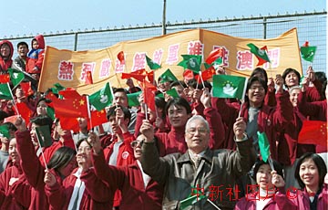 澳門(mén)各界人士二十日中午紛紛涌向街頭,高舉橫幅歡迎中國(guó)人民解放軍駐澳部隊(duì)。中新社傳真 李剛攝