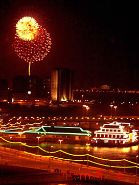 與澳門山水相連的珠海市二十日晚施放煙花慶祝澳門回歸,火樹銀花映紅了澳門海濱。 中新社數(shù)碼傳真 賈國榮攝
