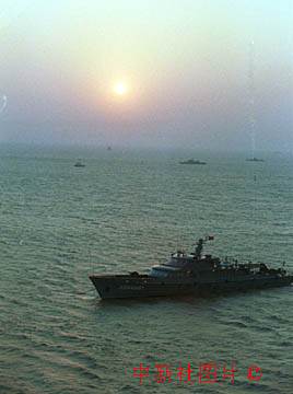 澳門回歸中國第一個(gè)日出海上紅日高照,映照在海邊擔(dān)負(fù)保衛(wèi)的艦艇。 中新社傳真 賈國榮攝